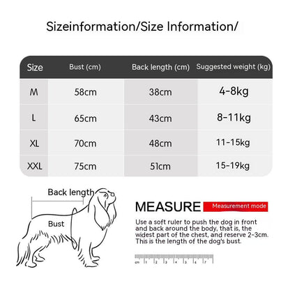 Size: M chest circumference 58cm back length 38cm weight 8-16kg, L chest circumference 65cm back length 43cm weight 16-22kg, XL chest circumference 70cm back length 48cm weight 22-30kg, XXL chest circumference 75cm back length 51cm weight 30-38kg